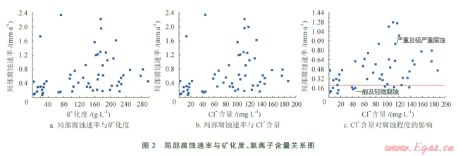 根據(jù)歷年油管腐蝕檢測(cè)結(jié)果,結(jié)合氣井產(chǎn)水量與氣井產(chǎn)出水礦化度和Cl含量對(duì)應(yīng)局部腐蝕速率的關(guān)系見(jiàn)圖2。