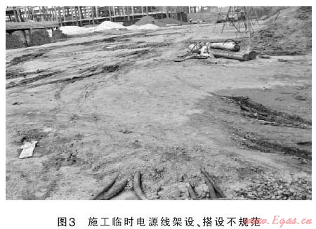 施工現(xiàn)場臨時用電往往貪圖方便不按規(guī)范操作接線。有的是將閘刀開關(guān)膠木蓋取下后把電源線直接掛在保險絲上,有的是將電纜線路明放于地面上。電纜線路雖進行了埋設(shè),但埋設(shè)深度淺,既不用細砂覆蓋,也不采用硬塊壓實,電纜接頭不加接接線盒,防水性差,給安全施工帶來隱患。