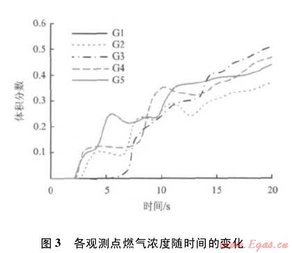 燃?xì)獾闹饕煞譃榧淄?,而甲烷與空氣混合后,當(dāng)甲烷濃度處于4.6%-14.3%的爆炸極限范圍[16]內(nèi)時(shí)遇到點(diǎn)火源才有可能發(fā)生爆炸。為了研究泄漏燃?xì)獗ㄎkU(xiǎn)區(qū)域的遷移特征,圖2給了不同時(shí)刻觀(guān)測(cè)剖面上燃?xì)鉂舛燃s在5%-15%時(shí)的區(qū)域。在泄漏初始階段,爆炸危險(xiǎn)區(qū)域位于泄漏孔上部。隨著泄漏擴(kuò)散的發(fā)展,房間上方充滿(mǎn)大量燃?xì)?,燃?xì)庀蛳逻\(yùn)移,危險(xiǎn)區(qū)域整體向下移動(dòng),最終遷移至地面附近。同時(shí),爆炸危險(xiǎn)區(qū)域范圍隨時(shí)間呈現(xiàn)由小變大,再由大變小的變化過(guò)程,在初始泄漏階段,氣體對(duì)流擴(kuò)散和分子運(yùn)移導(dǎo)致燃?xì)鈴男孤┛谙蛑車(chē)鷧^(qū)域擴(kuò)持續(xù)擴(kuò)散,形成爆炸危險(xiǎn)區(qū)域范圍由小變大的變化過(guò)程;隨著燃?xì)庑孤┝康脑黾雍屯牧鲾U(kuò)散的增強(qiáng),絕大部分區(qū)域的燃?xì)鉂舛瘸掷m(xù)上升,燃?xì)獠粩喽逊e,爆炸危險(xiǎn)區(qū)域范圍又呈現(xiàn)由大變小的變化過(guò)程。此外,位于房間下半部的爆炸危險(xiǎn)區(qū)域的持續(xù)時(shí)間明顯長(zhǎng)于房間上半部。這說(shuō)明,從爆炸危險(xiǎn)區(qū)域持續(xù)時(shí)間來(lái)看,房間下部區(qū)域更容易引發(fā)燃?xì)獗ā8饔^(guān)測(cè)點(diǎn)燃?xì)鉂舛入S時(shí)間的變化如圖3所示。各觀(guān)測(cè)點(diǎn)燃?xì)鉂舛入S時(shí)間均呈曲線(xiàn)上升趨勢(shì),且爆炸危險(xiǎn)區(qū)域最先達(dá)到房間頂部(觀(guān)測(cè)點(diǎn)G5約在2.47s時(shí)刻到達(dá)),然后逐漸向下遷移,越向下的觀(guān)測(cè)點(diǎn),其爆炸危險(xiǎn)區(qū)域到達(dá)得越晚(觀(guān)測(cè)點(diǎn)G1約7.5s時(shí)刻到達(dá))。