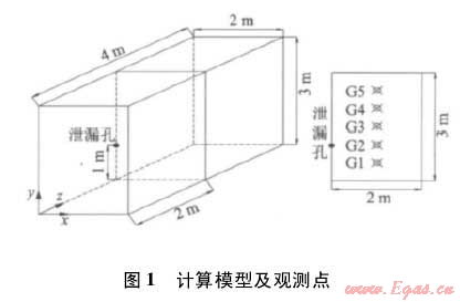 數(shù)值模擬基于流體力學(xué)守恒方程組,包括質(zhì)量守恒方程、動(dòng)量守恒方程、能量守恒方程和化學(xué)組分守恒方程。采用標(biāo)準(zhǔn)k-ε湍流模型來(lái)描述氣體的湍流流動(dòng)。結(jié)合實(shí)際民用建筑的廚房尺寸,將一密閉空間為作為研究對(duì)象,該空間長(zhǎng)、寬、高分別為4m(Z方向)、2m(X方向)、3m(Y方向),如圖1所示。假設(shè)廚房燃?xì)夤艿郎弦恢睆?/span>1cm的圓形泄漏孔位于墻壁附近,泄漏孔中心坐標(biāo)為(0,1,2)。結(jié)合我國(guó)城鎮(zhèn)民用建筑結(jié)構(gòu)燃?xì)夤艿赖墓ぷ鲏毫?,假定本文研究的燃?xì)夤艿拦ぷ鲏毫楹愣ㄖ?/span>2500Pa(表壓),泄漏孔為連續(xù)泄漏,且泄漏孔泄漏流量為恒定值。選取房間z=2m的剖面作為研究對(duì)象,著重考察爆炸危險(xiǎn)區(qū)域的遷移規(guī)律,并選取了該剖面上不同高度的五個(gè)觀(guān)測(cè)點(diǎn)(G1-G5)來(lái)分析燃?xì)鉂舛鹊臅r(shí)空分布特征,這五個(gè)觀(guān)測(cè)點(diǎn)的坐標(biāo)依次為(1,0.5,2)、(1,1,2)、(1,1.5,2)、(1,2,2)、(1,2.5,2)。計(jì)算時(shí)考慮重力加速度9.81m·s-2。燃?xì)獾闹饕煞譃榧淄?,在?jì)算中假設(shè)燃?xì)庵屑淄轶w積分?jǐn)?shù)為100%。