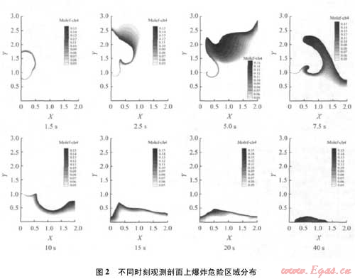 泄漏燃?xì)獗ㄎkU(xiǎn)區(qū)域的分布特征是分析燃?xì)庑孤U(kuò)散及評(píng)價(jià)事故后果的基礎(chǔ)和參考依據(jù)。在泄漏初始階段,爆炸危險(xiǎn)區(qū)域位于泄漏源部。隨著泄漏的不斷發(fā)展,爆炸危險(xiǎn)區(qū)域整體下移,最終遷移至地面附近。爆炸危險(xiǎn)區(qū)域范圍隨時(shí)間由小變大,再由大變小。爆炸危險(xiǎn)區(qū)域位于房間下部的持續(xù)時(shí)間明顯長(zhǎng)于房間中上部。