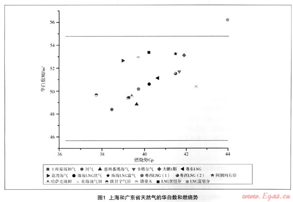 圖1列出了上海與廣東省一些氣源的華白數(shù)和燃燒勢(shì),其整體變化并不大,除LNG富組分外均落在國(guó)標(biāo)12T范圍之內(nèi)(華白數(shù)45.67~54.78MJ/m3,燃燒勢(shì)36.3~69.3,圖1中兩條直線中間的范圍即為國(guó)標(biāo)中12T的華白數(shù)范圍。)。其中最貧的是川氣,最富的是珠海LNG富氣(表1)。若按照95%的CH4純度來(lái)配制川氣和珠海LNG(富),即單一氣體CH4含有95%的CH4和5%的C2H6,則配制的川氣和珠海LNG(富)之華白數(shù)將增加,分別為49.22和53.93,偏差為1.73%和1.3%。顯然,若考察不同來(lái)源天然氣的組分不同所導(dǎo)致的燃?xì)饩咝阅茏兓?.73%和1.3%的偏差無(wú)法滿足實(shí)驗(yàn)要求,必須采用精確的配氣方法。
