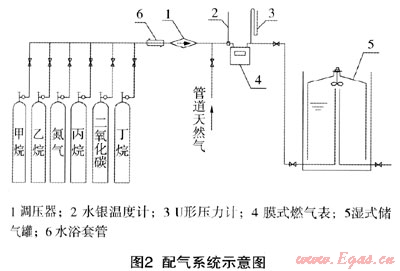 圖2為采用上述配氣方案時(shí)的流程示意圖。純組分氣體由鋼瓶減壓后,首先經(jīng)過(guò)水浴套管和減壓器,再經(jīng)膜式燃?xì)獗碛?jì)量,進(jìn)入內(nèi)置攪拌器的5m,濕式儲(chǔ)氣罐。