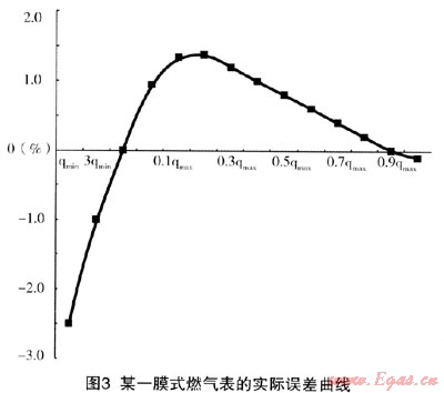 理想情況下燃?xì)獗碛?jì)量誤差是零,但是流量計(jì)均存在實(shí)際誤差曲線。按照設(shè)計(jì)圖生產(chǎn)的一批燃?xì)獗?,誤差曲線應(yīng)該是一樣的,但是,因?yàn)閷?shí)際生產(chǎn)工藝、裝配等因素影響,實(shí)際上每一臺(tái)表的誤差曲線是不同的[2]。圖3為某一膜式燃?xì)獗淼膶?shí)際典型的誤差曲線,其中橫坐標(biāo)x軸為檢定的流量點(diǎn),縱坐標(biāo)Y軸為相對(duì)誤差值(%)。