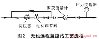 無線遠(yuǎn)程監(jiān)控站是在原有的區(qū)域中-低壓調(diào)壓站的基礎(chǔ)上,通過工藝改造增設(shè)羅茨流量計(jì)、壓力變送器、電動(dòng)調(diào)節(jié)閥、無線數(shù)據(jù)采集器(RTU)、后備電源以及無線數(shù)傳Modem構(gòu)成。無線遠(yuǎn)程監(jiān)控站工藝流程見圖2。無線數(shù)據(jù)采集器是一種具有采集、處理功能的自動(dòng)化設(shè)備,專門針對(duì)低功耗、無人值守站而設(shè)計(jì),與流量計(jì)、壓力傳感器、電動(dòng)閥門上的數(shù)據(jù)通信接口相連接,按內(nèi)置程序采集數(shù)據(jù)后,執(zhí)行操作指令上傳數(shù)據(jù),由無線數(shù)傳Modem接收信號(hào)并解碼壓縮后將信號(hào)傳回監(jiān)控中心的工控機(jī)。在后備電源的支持下,能夠保證系統(tǒng)在斷電的情況下正常運(yùn)行48h。