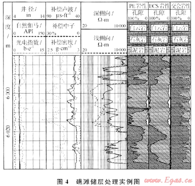 對(duì)于碳酸鹽巖儲(chǔ)層,儲(chǔ)層的巖石組分主要為白云巖和石灰?guī)r,一般用三孔隙度曲線(中子、聲波、密度)中任意兩條曲線交會(huì)進(jìn)行求解。但是,在天然氣層,由于受到天然氣的影響,中子和密度測(cè)井值偏低而聲波時(shí)差測(cè)井值偏高,導(dǎo)致計(jì)算的巖石組分含量不準(zhǔn)確。在目前的測(cè)井系列中,斯倫貝謝的ECS測(cè)井可計(jì)算出比較準(zhǔn)確的巖石組分含量,但價(jià)格昂貴;而光電吸收截面指數(shù)(PE)受儲(chǔ)層孔隙流體類型的影響小,而且價(jià)格低廉,所以可應(yīng)用于計(jì)算地層的巖石組分含量。圖4為川中某構(gòu)造礁灘儲(chǔ)層不同測(cè)井方法計(jì)算巖性剖面對(duì)比圖,從圖上可見(jiàn),光電吸收截面指數(shù)(PE)計(jì)算的巖性剖面與元素俘獲測(cè)井(ECS)處理的巖性剖面具有很好的一致性,而交會(huì)法計(jì)算的巖性剖面與ECS處理剖面一致性較差。所以,對(duì)于井眼狀況相對(duì)較好的碳酸鹽巖儲(chǔ)層,一般可測(cè)到高質(zhì)量的PE曲線,可應(yīng)用PE曲線確定巖石組分含量,再計(jì)算孔隙度等其他參數(shù),體現(xiàn)了本軟件在計(jì)算碳酸鹽巖儲(chǔ)層組分含量的優(yōu)越性。