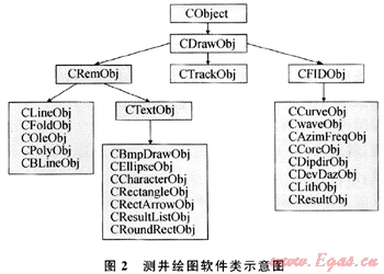 要解決這些問(wèn)題,采用面向?qū)ο蟪绦蛟O(shè)計(jì)理念是最佳的選擇[3]。在圖2軟件主要類的劃分及繼承關(guān)系圖中,CDrawObj類是直接從CObject繼承而來(lái)的所有測(cè)井圖形類的基類,主要保存著圖形對(duì)象的繪圖區(qū)域(m_Rect)和當(dāng)前繪圖文檔的指針(*pDoc),完成光標(biāo)在屏幕上的滾動(dòng)DoScroll(CScrollView*pView),保存、顯示當(dāng)前光標(biāo)所在位置等功能,它是測(cè)井繪圖軟件所有對(duì)象動(dòng)態(tài)識(shí)別的入口。