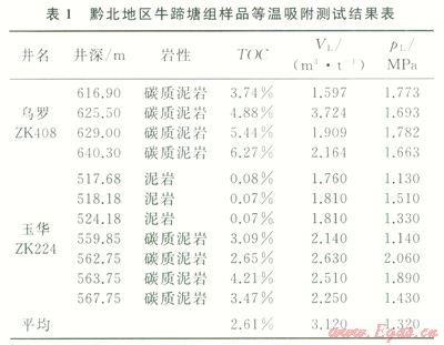 利用黔北地區(qū)烏羅ZK408井、玉華ZK224井13件現(xiàn)場(chǎng)解吸樣品進(jìn)行了等溫吸附實(shí)驗(yàn)。測(cè)試工作條件為:溫度,30℃;氦氣濃度,99.999%;甲烷濃度,99.9%;空氣干燥基樣品。等溫吸附實(shí)驗(yàn)測(cè)試結(jié)果如表1所示。