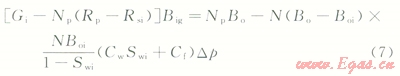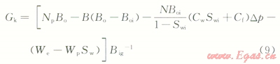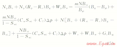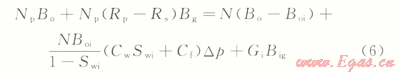 2)地面的累積產(chǎn)氣量為Gp,Gp=NpRp,Rp為累積生產(chǎn)氣油比。而在p壓力下累積產(chǎn)油量Np的溶解氣量為NpRs,Rs為p壓力下的溶解氣油比。因此,地層壓力由pi下降到p時,由油藏中多產(chǎn)出的天然氣地下體積量為Np(Rp-Rs)Bg,Bg為p壓力下的天然氣體積系數(shù)。