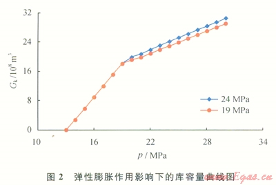 其次,由于地層壓力的降低,受地層巖石和束縛水的彈性作用的影響,會造成不可逆的孑L隙和裂縫體積縮小,從而影響庫容量。興古7古潛山油藏儲氣庫運行壓力下限由24MPa降為19MPa時,因受地層巖石和束縛水彈性膨脹的影響,地下儲氣庫庫容量將由30.52×108m3減少為29.01×108m3(圖2),損失了1.51×108m3,占總庫容量的4.94%。