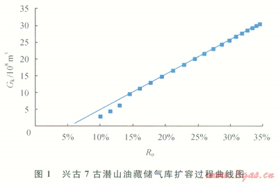 根據(jù)上述方法,計算了興古7古潛山油藏在氣驅(qū)開發(fā)過程中,油層中部深度地層壓力保持在27.25MPa下的原油不同采出程度(Ro)時所對應(yīng)的地下儲氣庫庫容量,當油藏達到最終采收率為34.48%、地層壓力為30MPa時,地下儲氣庫的庫容量為30.52×108m3(圖1)。