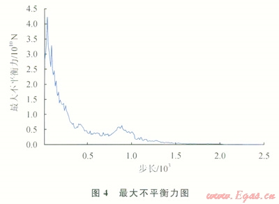 數(shù)值分析采用迭代方法計(jì)算,在迭代過(guò)程中監(jiān)控一些變量或參數(shù)的變化,以判斷分析結(jié)果是否正確,模型是否與實(shí)際相符[6-7]。監(jiān)控模型最大不平衡力,所謂體系最大不平衡力,是指每一個(gè)計(jì)算循環(huán)中,外力通過(guò)網(wǎng)格節(jié)點(diǎn)傳遞分配到體系各節(jié)點(diǎn)時(shí),所有節(jié)點(diǎn)的外力與內(nèi)力之差中的最大值。如圖4~6監(jiān)控了最大不平衡力,并記錄了位移等值線圖和應(yīng)力等值線圖。
