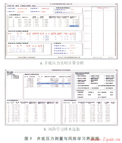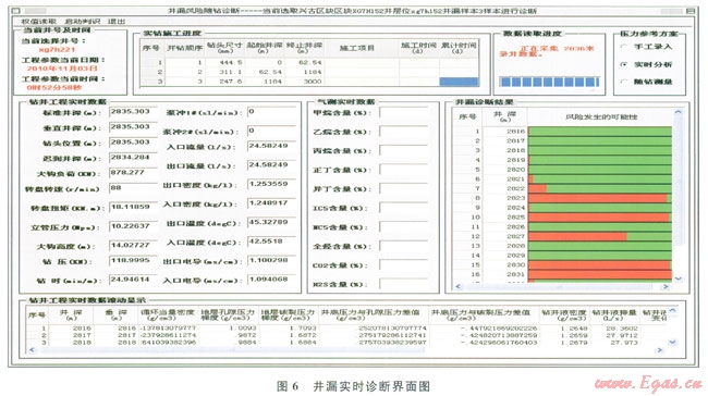 在我國某油田鉆井時,應(yīng)用鉆井風險控制系統(tǒng)實時診斷鉆井狀態(tài),分別對鉆井實時數(shù)據(jù)采集軟件、鉆井實時數(shù)據(jù)庫管理軟件、鉆井風險因素實時計算分析軟件和鉆井風險推理風險軟件進行現(xiàn)場測試(圖5、6)。以采集的鉆井實時數(shù)據(jù)為基礎(chǔ),應(yīng)用鉆井風險因素實時分析軟件計算井底壓力和地層壓力等參數(shù),以鄰井資料作為井漏風險學習的樣本,判斷該井井漏風險,系統(tǒng)判斷該井在鉆至2823m時井漏風險可能性較大,當鉆進至2825m時技術(shù)人員發(fā)現(xiàn)井底發(fā)生漏失,決定進行起鉆堵漏作業(yè)。現(xiàn)場測試表明鉆井風險控制系統(tǒng)的數(shù)據(jù)采集軟件與儀器測量儀器同步性好,數(shù)據(jù)庫設(shè)計合理,且井漏風險實時診斷預(yù)測結(jié)果與現(xiàn)場完全吻合。