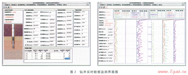 3)建立了以國際通用WITS標準為參考依據(jù)的鉆井風險控制系統(tǒng)數(shù)據(jù)庫,并優(yōu)化了數(shù)據(jù)庫結(jié)構(gòu)及查詢模式,開發(fā)了鉆井風險控制系統(tǒng)實時數(shù)據(jù)庫管理軟件。軟件為用戶提供了數(shù)據(jù)庫備份、數(shù)據(jù)庫還原功能;可以瀏覽、修改、查詢、導出、導入、刪除、整理任意井的鉆井數(shù)據(jù);可以對各種數(shù)據(jù)進行實時顯示、按時間回放、按井深回放;可以將任意數(shù)據(jù)導出到文本文件中;可以進行異地備份;可以按用戶需要導入相關(guān)數(shù)據(jù),鉆井實時數(shù)據(jù)監(jiān)測界面如圖2所示。
