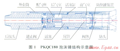 空氣錘在油氣田“防斜打快”應(yīng)用中逐步成熟[1-3],應(yīng)用范圍從傳統(tǒng)防斜提速開(kāi)始向定向鉆井發(fā)展[4]。但也還存在鉆遇地層出水,空氣錘易出現(xiàn)輸出功率低或不工作的問(wèn)題[5]及地層液體倒灌氣缸污染空氣錘問(wèn)題。國(guó)內(nèi)外曾在泡沫介質(zhì)中應(yīng)用空氣錘鉆進(jìn)[6-7],但主要限于淺地層,井底壓力較小,對(duì)空氣錘輸出功率影響程度較小。在油氣鉆井行業(yè),由于井深大,使用霧化或泡沫后井底壓力相對(duì)純氣體高,對(duì)常規(guī)空氣錘輸出功率影響較大,有必要同時(shí)發(fā)展適應(yīng)于氣體(干氣)和霧化或泡沫(濕氣)鉆井介質(zhì)的泡沫錘技術(shù)。為此,筆者主要介紹了泡沫錘的研制背景、結(jié)構(gòu)及性能特點(diǎn)以及在現(xiàn)場(chǎng)中的應(yīng)用效果。時(shí)導(dǎo)致空氣錘無(wú)輸出功率;針對(duì)此問(wèn)題提出了綜合優(yōu)化后氣室初始體積、優(yōu)化尾管結(jié)構(gòu)尺寸、優(yōu)化動(dòng)力單元間隙的技術(shù)建議。