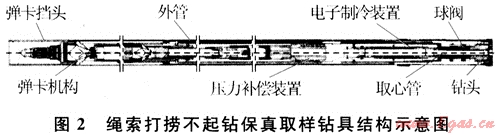 張永勤等[21]承擔(dān)的“十五”國家高技術(shù)研究發(fā)展計劃項目“深水深孔天然氣水合物保真取樣鉆具的研制”,分別研制了繩索打撈不起鉆保真取樣鉆具和投球起鉆式保壓取樣鉆具:①繩索打撈不起鉆取樣鉆具系統(tǒng)(圖2)主要由內(nèi)管總成、外管總成、鉆桿、打撈裝置、繩索絞車等組成,不起鉆可實現(xiàn)連續(xù)取心作業(yè)。齒條齒輪機構(gòu)使球閥旋轉(zhuǎn)90°,密封巖心容管。為了更可靠地保持水合物的原始狀態(tài),在鉆具結(jié)構(gòu)上設(shè)有蓄能壓力補償裝置。電子制冷裝置由保溫層和電子制冷器組成,保持樣品的溫度。繩索打撈不起鉆取樣技術(shù)具有勞動強度低、效率高、輔助肘間少等優(yōu)點,主要技術(shù)參數(shù)為:鉆孔直徑為174~190mm;巖心直徑為30~40mm;單次取心長度為3m。②投球起鉆式保壓取樣鉆具可直接連接到現(xiàn)有的石油鉆井鉆桿上進行鉆進取樣,但取樣時必須起出孔內(nèi)的全部鉆桿及鉆具,球閥關(guān)閉時采用泥漿作為動力介質(zhì),該鉆具與現(xiàn)有海洋石油鉆機配套鉆井施工時無需進行任何設(shè)備改造,利用現(xiàn)有的Ф114mm、Ф127mm、Ф140mm鉆桿即可鉆井施工。