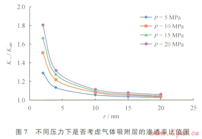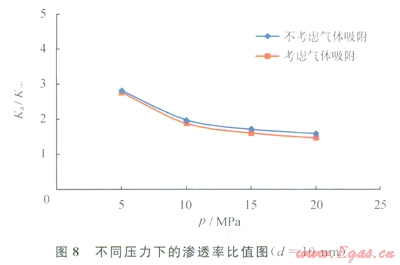 根據(jù)式(8),可以計算出不同的壓力下孔隙受到吸附層影響之后的實際有效孔隙半徑,利用有效半徑和實際半徑,再用式(9)可計算出吸附層對其滲透率的影響程度。圖7為不同的壓力和孔隙直徑下,孔隙的固有滲透率同存在吸附層時的滲透率比值,此時假設(shè)Langmuir壓力為12.5MPa,這里所計算的滲透率均為等效液體滲透率,也就是不考慮氣體滑脫效應(yīng)。