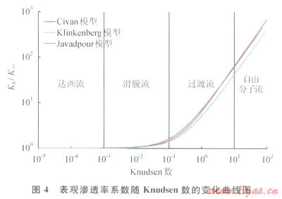 Klinkenberg方程可以寫為以Knudsen數(shù)表征的形式: