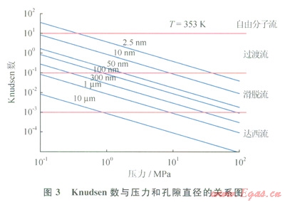 假定氣藏溫度為353K,圖3給出了不同的壓力條件下,甲烷氣在不同級別的孔隙中流動時的Knudsen數(shù),圖3中右側(cè)給出了不同的流態(tài)的界限,可以看出:頁巖納米孔隙中的主要流態(tài)是滑脫流和過渡流。