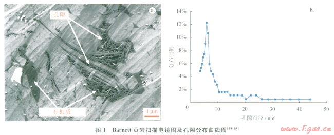 對于大部分的頁巖,其孔隙半徑比常規(guī)儲層要低得多,圖1-a為Barnett頁巖不同樣品的掃描電鏡圖像,可以看出,頁巖基質(zhì)主要由黏土礦物(淺灰色物質(zhì))和有機質(zhì)或干酪根組成(深灰色物質(zhì)),孔隙主要分布在有機質(zhì)中,且這些孔隙主要是納米孔隙。圖1-b所示為通過壓汞法所測得的一個Barnett頁巖的孔隙大小分布曲線,其主要孔隙半徑分布范圍在10nm以下。2010年,鄒才能等人在中國頁巖儲層發(fā)現(xiàn)納米級孔隙[12-13],指出頁巖氣儲層納米級孔隙以有機質(zhì)內(nèi)孔、顆粒內(nèi)孔及白生礦物品間孔為主,孔隙直徑范圍為5~300nm,主體為80~200nm。