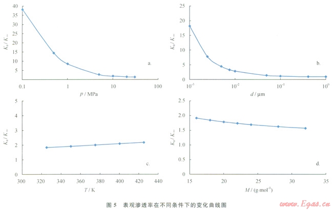 根據(jù)式(6)可知,溫度、壓力、孔隙半徑等因素均對氣體滑脫存在影響,采用Javadpour模型分析以上不同因素對頁巖納米孔隙氣體滑脫的影響程度(圖5)。圖5-a是溫度為353K的條件下,甲烷氣在10nm的孔隙中流動時,表觀滲透率隨著壓力的變化曲線;圖5-b是溫度為353K、壓力5MPa的條件下,甲烷氣在不同半徑的孔隙中流動時,表觀滲透率隨著壓力的變化曲線;圖5-c是壓力為5MPa,甲烷氣在孔隙半徑為10nm的孔隙中流動時,表觀滲透率隨著溫度的變化曲線;圖5-d為壓力為5MPa,溫度為353K,摩爾質(zhì)量不同的氣體在孔隙半徑為10nm的孔隙中流動時,靜觀滲透率隨著溫度的變化曲線。