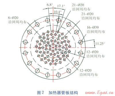加熱器結(jié)構(gòu)見圖1。為確保換熱管加熱效率,換熱管在管板上二呈圓周布置,相鄰同心圓上,管間距不同,從而導致管板結(jié)構(gòu)特殊,不同于GB 151—1999《管殼式換熱器》中規(guī)定的換熱管標準布管排列形式(正三角形排列或正四方形排列)。