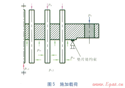 模型承受內(nèi)壓力和螺栓力,由于內(nèi)壓的作用,在溫度計護管、換熱管的截面會產(chǎn)生等效力,等效力以均布壓力的形式施加到相應位置,見圖5。