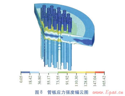 管板承受最高工作壓力為5.5MPa、最低工作壓力為0.0MPa,根據(jù)式(2)~(5),計算出在最高工作壓力pin=5.5MPa時管板承受各項載荷數(shù)據(jù),見表4。通過軟件計算,得到應力強度幅云圖,見圖8,圖中數(shù)值為應力強度幅,單位為MPa。
