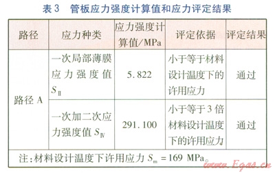 對于薄壁結(jié)構(gòu),JB 4732—1995《鋼制壓力容器——分析設計標準》(2005年確認)第5.3節(jié)給出了應力強度的評定依據(jù):一次局部薄膜應力強度值SⅡ小于等于1.5Sm;一次加二次應力強度值SⅣ小于等于3Sm。對U形換熱管不存在管子對管板的彈性基礎作用,從管板系統(tǒng)安全裕度出發(fā),本工程SⅡ取小于等于1.0Sm。按照上述評判依據(jù),對計算應力值與材料許用應力值進行比較,從而完成應力評定,確定結(jié)構(gòu)承壓條件下的安全性[3]。應力評定結(jié)果見表3。