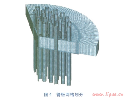 本例使用ANSYS軟件按表1尺寸建立有限元模型??紤]到管孔的對稱性,可建立l/3等效模型,見圖3。初步取管板厚度dn=68mm,其余結(jié)構(gòu)尺寸按表1選取。因換熱管采用焊接方式連接在管板上,建模時可以認為換熱管與管板已達到一體化程度,單元是相互連接的,不存在接觸問題。應力邊緣效應的影響長度公式為[2]: