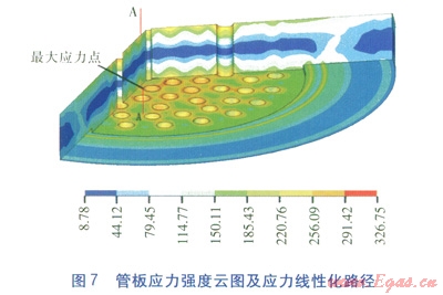 應力線性化是ANSYS軟件對運算結(jié)果進行后處理以讀取計算數(shù)據(jù)的方法。應力線性化路徑的選取原則是:通過應力強度最大位置處的節(jié)點,并以最短距離橫穿構(gòu)件壁的方向設定應力線性化路徑[4]。軟件系統(tǒng)則在路徑上通過內(nèi)插法自動生成插值點,并把計算結(jié)果映射到路徑上。軟件會自動對計算結(jié)果進行應力分類,并顯示相應路徑下的各類計算應力值?;诒?span lang="EN-US">2強度計算所需載荷數(shù)據(jù),通過軟件計算,得到管板應力強度分布及應力線性化路徑,見圖6、7,圖中數(shù)值為應力強度,單位為MPa。