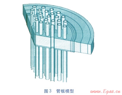 因此,建模時在理論上換熱管在管板兩側(cè)需要保留的外伸長度應大于9.7mm,即可滿足要求。根據(jù)工程實際情況,該模型取換熱管相對于管板向上外伸長度為140mm,向下外伸長度為300mm(實際加熱器換熱管相對于管板向上外伸長度為160mm,向下外伸長度為2400mm)。