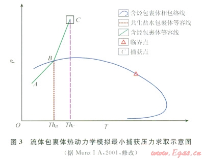 目前古流體壓力值測(cè)定方法有多種[8-18],筆者結(jié)合本地區(qū)油氣成藏的地質(zhì)條件,采用流體包裹體PVT模擬法來計(jì)算古流體壓力值。如圖3中,ABC線為烴類包裹體或含烴鹽水包裹體等容線,AB段為氣液兩相共存,到B點(diǎn)均一為液相;ThB為含烴鹽水或烴類流體包裹體均一溫度,ThC為同期鹽水包裹體均一溫度。