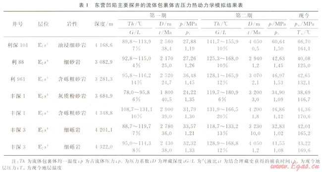 將各期次鹽水包裹體的均一溫度及其共生的同期含烴鹽水包裹體或烴類包裹體的均一溫度、氣/液比和化學(xué)組成輸入VTFLINC軟件,即可獲得熱動(dòng)力學(xué)模擬結(jié)果——各期次流體包裹體的最小捕獲壓力和壓力系數(shù)。利用東營凹陷北帶利津、民豐等地區(qū)所采集樣品獲得“數(shù)據(jù)對(duì)”的樣品開展了熱動(dòng)力學(xué)模擬,模擬得到了主要探井的部分古流體壓力(表1)。