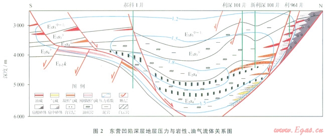 東營凹陷是中國東部富油氣凹陷之一,含油氣豐度高,探明儲(chǔ)量大,目前已發(fā)現(xiàn)的油氣主要分布于埋深小于3500m的地層。隨著近期深層勘探的不斷深入,在東營凹陷北部陡坡帶的民豐、利津等地區(qū)發(fā)現(xiàn)了凝析氣藏和氣藏,實(shí)現(xiàn)了深層勘探的重大突破,展示了深層較好的油氣勘探前景。但是,油氣藏的地質(zhì)條件和流體壓力存在較大的差異,在古近紀(jì)的構(gòu)造演化過程中,兩地區(qū)存在沉降中心的轉(zhuǎn)換,導(dǎo)致沉積作用、生烴作用和油氣富集發(fā)生較大的變化,直接表現(xiàn)出深層凝析氣藏和氣藏的地層壓力既有常壓,也有超壓。