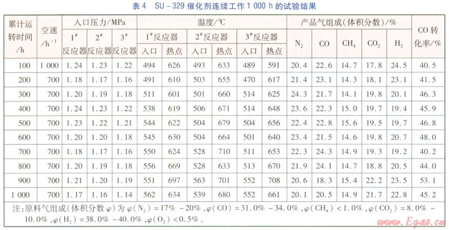 1#反應(yīng)器入口壓力為1.15~1.25MPa,1#反應(yīng)器入口溫度為490~560℃,原料氣中CO體積分?jǐn)?shù)為31%~34%的穩(wěn)定運(yùn)轉(zhuǎn)條件下,SU-329催化劑原料氣的低熱值比為1.17左右,產(chǎn)品氣的低熱值為 連續(xù)工作1000h的試驗(yàn)結(jié)果見(jiàn)表4。