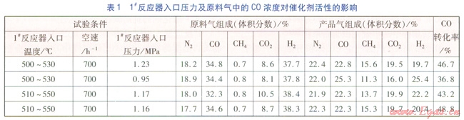 1#反應(yīng)器入口壓力及原料氣中CO的濃度均有一定波動(dòng),會(huì)影響催化劑的活性,對(duì)此進(jìn)行了試驗(yàn),試驗(yàn)條件及結(jié)果見(jiàn)表1。
