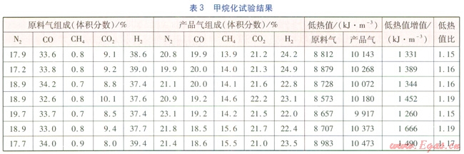 由表3可知,產(chǎn)品氣中CO體積分?jǐn)?shù)小于等于20%,CH4體積分?jǐn)?shù)為13.9%~15.6%,產(chǎn)品氣與10000kJ/m3左右,增值達(dá)1400kJ/m3左右。