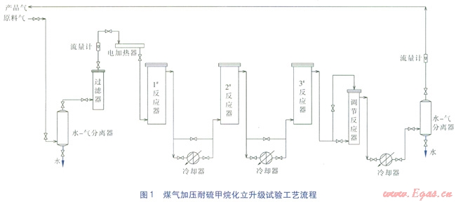 煤氣加壓耐硫甲烷化立升級(jí)試驗(yàn)的工藝流程見(jiàn)圖1。原料氣直接從煤氣生產(chǎn)系統(tǒng)中引取,原料氣中H2S含量為40~60mg/L,總硫含量約為250~300mg/L。原料氣(冷煤氣)依次通過(guò)水—氣分離器(分離掉水分)和過(guò)濾器,經(jīng)流量計(jì)計(jì)量后,經(jīng)電加熱器加熱后進(jìn)入1#反應(yīng)器參加反應(yīng)。從1#反應(yīng)器出來(lái)的熱煤氣可直接進(jìn)入2#反應(yīng)器參加反應(yīng),當(dāng)催化劑床層熱點(diǎn)溫度大于650℃時(shí),從1#反應(yīng)器出來(lái)的熱煤氣經(jīng)冷卻器冷卻后再進(jìn)入2#反應(yīng)器參加反應(yīng)。從2#反應(yīng)器出來(lái)的熱煤氣可直接進(jìn)入3#反應(yīng)器參加反應(yīng),當(dāng)催化劑床層熱點(diǎn)溫度大于650℃時(shí),從2#反應(yīng)器出來(lái)的熱煤氣經(jīng)冷卻器冷卻后再進(jìn)入3#反應(yīng)器參加反應(yīng)。從3#反應(yīng)器出來(lái)的熱煤氣進(jìn)入調(diào)節(jié)反應(yīng)器(如果催化劑性能尚可,則從3#反應(yīng)器出來(lái)的熱煤氣從頂部進(jìn)入調(diào)節(jié)反應(yīng)器,隨即離開(kāi),不參加反應(yīng);如果催化劑性能不好,則從3#反應(yīng)器出來(lái)的熱煤氣從下部進(jìn)入調(diào)節(jié)反應(yīng)器,熱煤氣參加反應(yīng)),從調(diào)節(jié)反應(yīng)器出來(lái)的熱煤氣經(jīng)過(guò)冷卻器后進(jìn)入水—氣分離器,經(jīng)水—氣分離器分離掉水分后,再經(jīng)流量計(jì)計(jì)量得到產(chǎn)品氣。