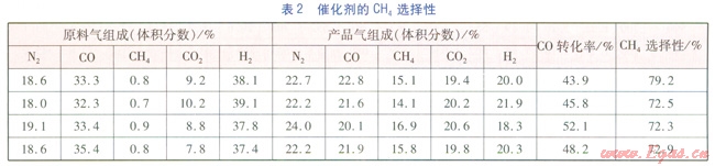 由表l可知,當(dāng)原料氣中CO濃度基本相同時(shí),在1#反應(yīng)器入口溫度相同的條件下,隨著1#反應(yīng)器入口壓力的降低,產(chǎn)品氣中的CH4含量和CO轉(zhuǎn)化率下降明顯,這說(shuō)明催化劑活性對(duì)壓力變化很敏感。當(dāng)1#反應(yīng)器人口壓力幾乎不變時(shí),在1#反應(yīng)器入口溫度相同的條件下,隨著原料氣中CO濃度的降低,產(chǎn)品氣中的CH4含量和CO轉(zhuǎn)化率也隨之下降。