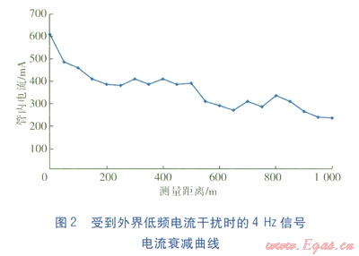 一般情況下,管道內的信號電流應該隨著測量距離的增大而不斷衰減,但是當存在外界低頻電流干擾時,4Hz的信號電流會出現(xiàn)突然反彈或者波動的現(xiàn)象,受到外界低頻電流干擾時的4Hz信號電流衰減曲線見圖2[6]。外界干擾的低頻電流會與檢測中使用的4Hz低頻信號電流互相作用,產生疊加或抵消,當疊加時,會出現(xiàn)圖2中信號電流反彈升高的情況;當?shù)窒麜r,會出現(xiàn)信號電流驟然變小的情況。無論是疊加還是抵消,都會對防腐層的檢測結果產生很大影響,甚至嚴重失真。