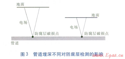 一般地,城鎮(zhèn)燃氣管道各處埋深不同。不同的管道埋深將會對防腐層破損點處泄漏電流產生的電場產生很大影響。假設管道防腐層的破損情況相同、周圍土壤電阻率變化不大,當管道埋深較小時,從防腐層破損點向外傳導的電流相對集中,在地面上檢測到的電流較大;而當管道埋深較大時,在地面上檢測到的電流較小(見圖3)。