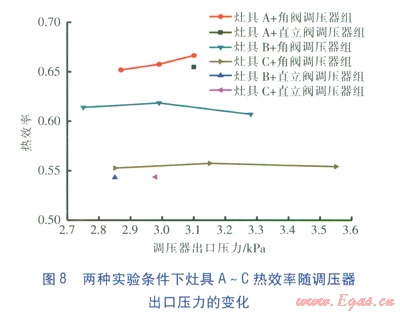 以直立閥鋼瓶作為氣源的實(shí)驗(yàn)方法為:選取鋼瓶內(nèi)壓為0.03MPa,進(jìn)行灶具熱效率實(shí)驗(yàn)。待灶具燃燒穩(wěn)定后,將盛裝一定水的鋁鍋放于灶具上,待水溫升至高于初始溫度5℃時(shí),開始攪拌,并計(jì)量燃?xì)夂牧?。待水溫比初始溫度?span lang="EN-US">30℃時(shí),關(guān)閉灶具。實(shí)驗(yàn)數(shù)據(jù)經(jīng)過計(jì)算,可以得到灶具的熱效率[3]。以角閥鋼瓶作為氣源的實(shí)驗(yàn)方法為:在LPG鋼瓶滿瓶條件下,分別將調(diào)壓器調(diào)至最大壓力(對(duì)應(yīng)調(diào)壓器最大刻度)、中間壓力、最小壓力(對(duì)應(yīng)調(diào)壓器最小刻度)進(jìn)行實(shí)驗(yàn),實(shí)驗(yàn)方法與以直立閥鋼瓶作為氣源的實(shí)驗(yàn)方法相同。兩種實(shí)驗(yàn)條件下灶具A~C熱效率隨調(diào)壓器出口壓力的變化見圖8。