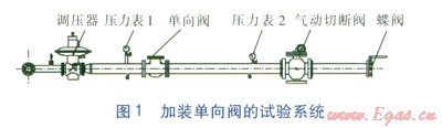 當(dāng)用戶用氣設(shè)備突然停機(jī),會(huì)造成調(diào)壓器出口管段內(nèi)壓力瞬間升高,其原因主要是用氣設(shè)備的切斷速度極快(切斷時(shí)間小于1s),而調(diào)壓器的閥口關(guān)閉速度慢(需3~4s),調(diào)壓器閥口關(guān)閉的響應(yīng)時(shí)間比用戶用氣設(shè)備切斷閥的切斷時(shí)間長(zhǎng),造成用戶用氣設(shè)備切斷后,調(diào)壓器上游還有少量氣體輸送至下游,造成下游管段壓力瞬間升高。如何抑制調(diào)壓器出口壓力的突然上升?本文從在調(diào)壓器出口管段上加裝單向閥、加裝安全放散閥以及調(diào)整用戶端用氣設(shè)備控制閥門的關(guān)閉程序等3個(gè)方面進(jìn)行試驗(yàn)研究。