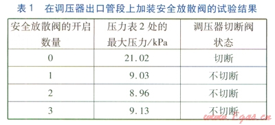 試驗(yàn)方法:調(diào)壓器進(jìn)口壓力設(shè)定為0.4MPa,出口壓力設(shè)定為7kPa,調(diào)壓器切斷閥的切斷壓力設(shè)定為9.8kPa,安全放散閥開(kāi)啟壓力為8.4kPa。對(duì)不開(kāi)啟安全放散閥、開(kāi)啟l個(gè)安全放散閥、開(kāi)啟2個(gè)安全放散閥及開(kāi)啟3個(gè)安全放散閥這3種工況進(jìn)行試驗(yàn),觀察壓力表2的讀數(shù),試驗(yàn)結(jié)果見(jiàn)表1。