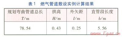 接著分別計(jì)算彎曲管道的拱高、彎管外矢距和彎管彎曲段間直管段長度,并將計(jì)算結(jié)果列于表1。