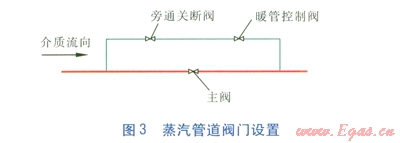 蒸汽管道的啟動(dòng)需要有一個(gè)暖管過(guò)程。CJJ 34—2010第8.5.10條要求“蒸汽管道啟動(dòng)暖管需控制流量時(shí),管道閥門(mén)應(yīng)裝設(shè)口徑較小的旁通閥作為控制閥門(mén)”。這是由于主閥口徑較大時(shí),若暖管過(guò)程使用主閥小開(kāi)度暖管,高速蒸汽通過(guò)主閥小開(kāi)度的縫隙,蒸汽分子或管道內(nèi)的其他微小雜質(zhì)顆粒沖刷密封面,使密封面遭到破壞。CJJ 34—2010要求蒸汽管道啟動(dòng)暖管需控制流量時(shí)管道閥門(mén)應(yīng)裝設(shè)口徑較小的旁通閥作為控制閥門(mén)無(wú)疑是正確的,因?yàn)檫@樣做可以保護(hù)大口徑主閥。但是還應(yīng)該注意小口徑旁通閥的時(shí)徑和閥門(mén)類(lèi)型的合理選擇,根據(jù)我們的實(shí)踐經(jīng)驗(yàn),小口徑旁通閥的口徑應(yīng)按主閥口徑的1/10選取,但最小不應(yīng)小于DN 50mm。而且小口徑旁通閥應(yīng)設(shè)置兩個(gè)(見(jiàn)圖3),一個(gè)作為暖管時(shí)的控制閥,另一個(gè)作為旁通管的關(guān)斷閥,這兩個(gè)小口徑閥門(mén)均應(yīng)選擇截止閥。這是因?yàn)檎羝軙r(shí)間較長(zhǎng),有時(shí)候控制閥暖管時(shí)的開(kāi)度仍然較小,仍然有較大可能因高速蒸汽通過(guò)控制閥小開(kāi)度的縫隙時(shí)將控制閥的密封面破壞,如果不再設(shè)置一個(gè)旁通關(guān)斷閥,一旦暖管控制閥的密封面被破壞,主閥的關(guān)閉將起不到關(guān)斷管路的作用。