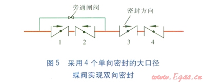 經(jīng)研究,如圖5所示采用4個(gè)單向密封的大口徑蝶閥,達(dá)到雙向密封的目的,而且采取保護(hù)措施,可以使大口徑蝶閥長(zhǎng)期處于良好工作狀態(tài)。