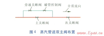 在可能的情況下,蒸汽管道暖管啟動(dòng)后,盡可能待管道閥后蒸汽壓力達(dá)到閥前壓力時(shí)再開(kāi)啟大口徑主閥,這樣可以保證大口徑閥門(mén)開(kāi)啟過(guò)程中前后無(wú)壓差,大口徑閥門(mén)的密封面可得到有效的保護(hù)。如果蒸汽壓力較高(1.0MPa或以上)且無(wú)法做到利用旁通閥使閥后壓力達(dá)到或接近閥前壓力時(shí)開(kāi)啟主閥,為保護(hù)大口徑主閥的密封面,可采取雙主閥的布置方法(見(jiàn)圖4)。