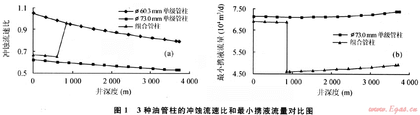 因為Ø60.3mm單級油管柱不能滿足沖蝕要求,所以在下面的攜液能力分析中只對Ø73.0mm單級油管柱和Ø73.0mm×850m+Ø60.3mm×2880m組合油管柱進行對比分析。